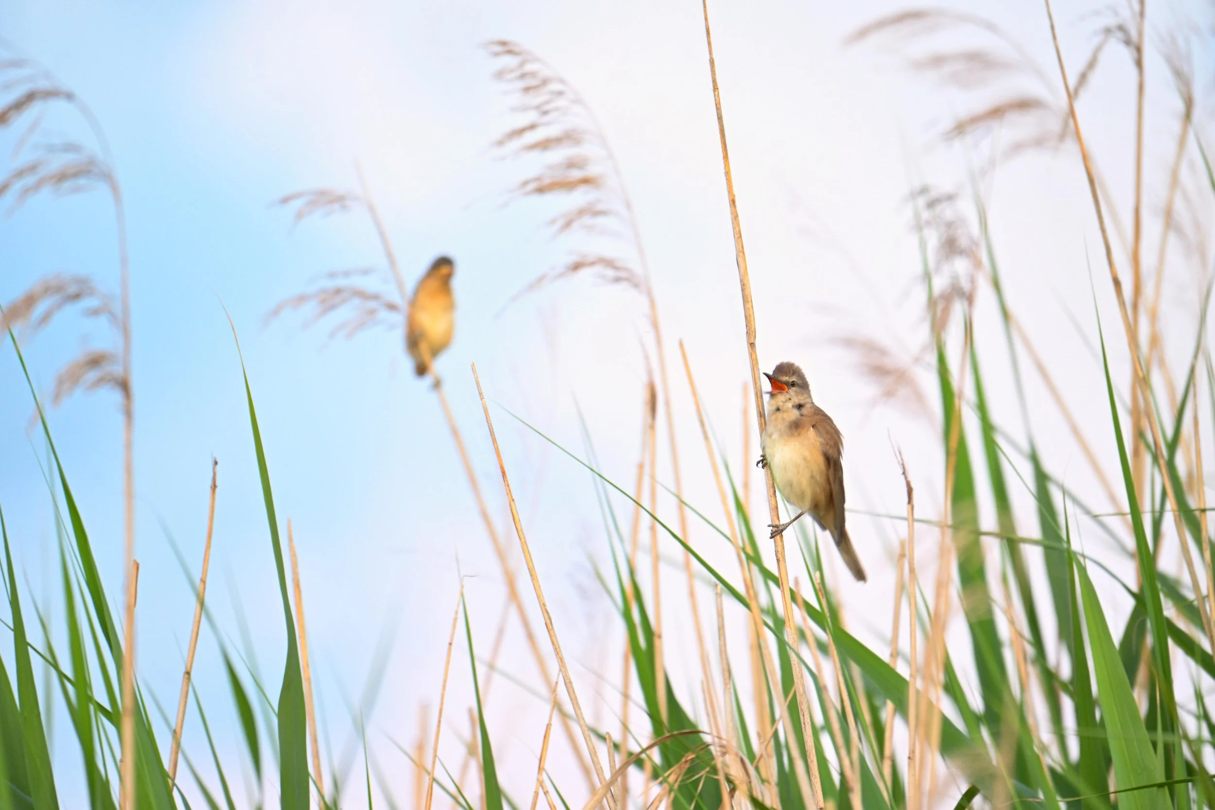 An einem warmen Sommerabend mache ich mich ohne festen Plan auf den Weg in die Natur. Am Feldrand, umgeben vom Schilf im Abendlicht, beobachte ich einen Rehbock und sogar kurz einen Fuchs, bevor ich mein eigentliches Motiv entdecke: den Schilfrohrsänger. Sein Gesang begleitet mich schon den ganzen Abend, und schließlich setzt er sich perfekt ins Licht. Ein zweiter Vogel gesellt sich dazu – die Szene ist wie geschaffen für ein Foto. In diesem spontanen Moment entsteht ein Bild voller Sommerstimmung, das mich daran erinnert, wie wertvoll es ist, einfach draußen zu sein und die Natur bewusst zu erleben.