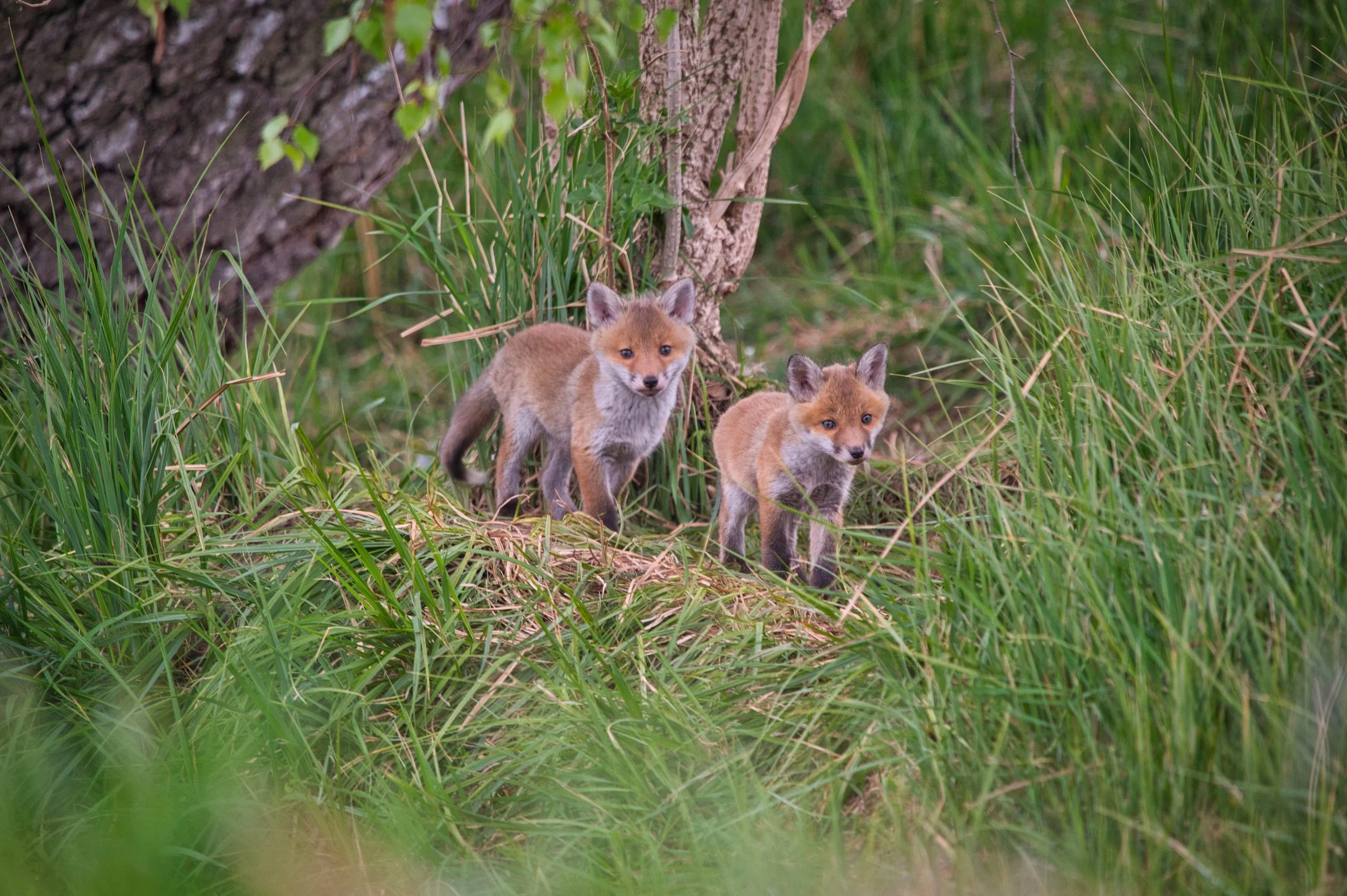 Das Frühjahr ist für mich die spannendste Zeit, besonders die Suche nach einem bewohnten Fuchsbau gehört jedes Jahr dazu. In diesem Jahr habe ich Glück: an einem vertrauten Graben entdecke ich eine aktive Fuchsfamilie. An einem Abend pirsche ich mich vorsichtig heran, lege mich ins Gras und schon bald erscheinen zwei neugierige Welpen. Sie tollen verspielt umher, tapsen durchs Grün und blicken schließlich direkt in meine Kamera. Für einen Moment darf ich Teil ihrer Welt sein. Leise ziehe ich mich später zurück, erfüllt von Dankbarkeit und dem Wissen, wie wichtig Rücksicht und Respekt in der Natur sind.